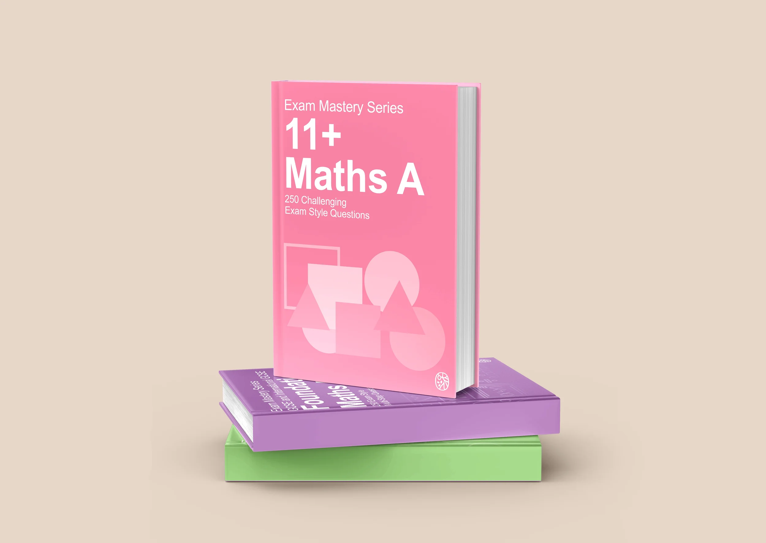 A pink book titled "11+ Maths A" from the Exam Mastery Series, standing on top of two other books, one purple and one green, against a beige background.
